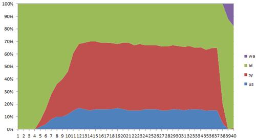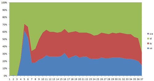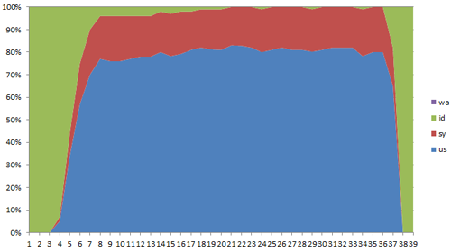 This is the system usage during the Nginx test. Clearly system time was the driver for throughput. It matches the throughput almost exactly. Though, I wonder if this is a function of network saturation because of the downward slope of the throughput for system time. If the throughput decline was due to increased system time then the system time should increase while throughput decreases. Instead we see them in lock step. For that reason I believe that the overhead of additional HTTP payload (headers, and such), would explain the decline. In other words, Nginx could probably do better.