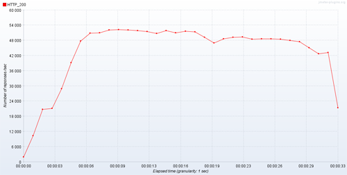 The peak throughput was around 53,000 requests per second, compared to Nginx’s 47k.
