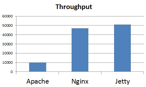 The first graph is the test results. The test was retrieving the favicon.ico file on a 4xIntel(R) Xeon(R) CPU X3430 @ 2.40GHz. with 16GB RAM. All webservers were configured to run on their defaults. That means that these numbers could be improved. In fact, Nginx could possibly double its throughput (but, then again, so could Jetty, for reasons we’ll see in a bit). Apache is pretty much at its limit.